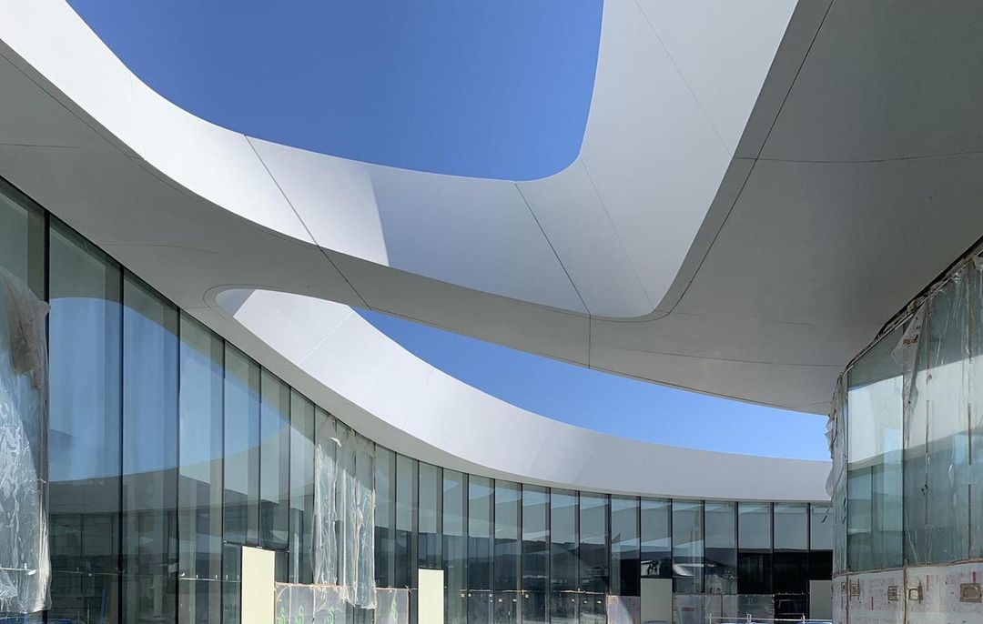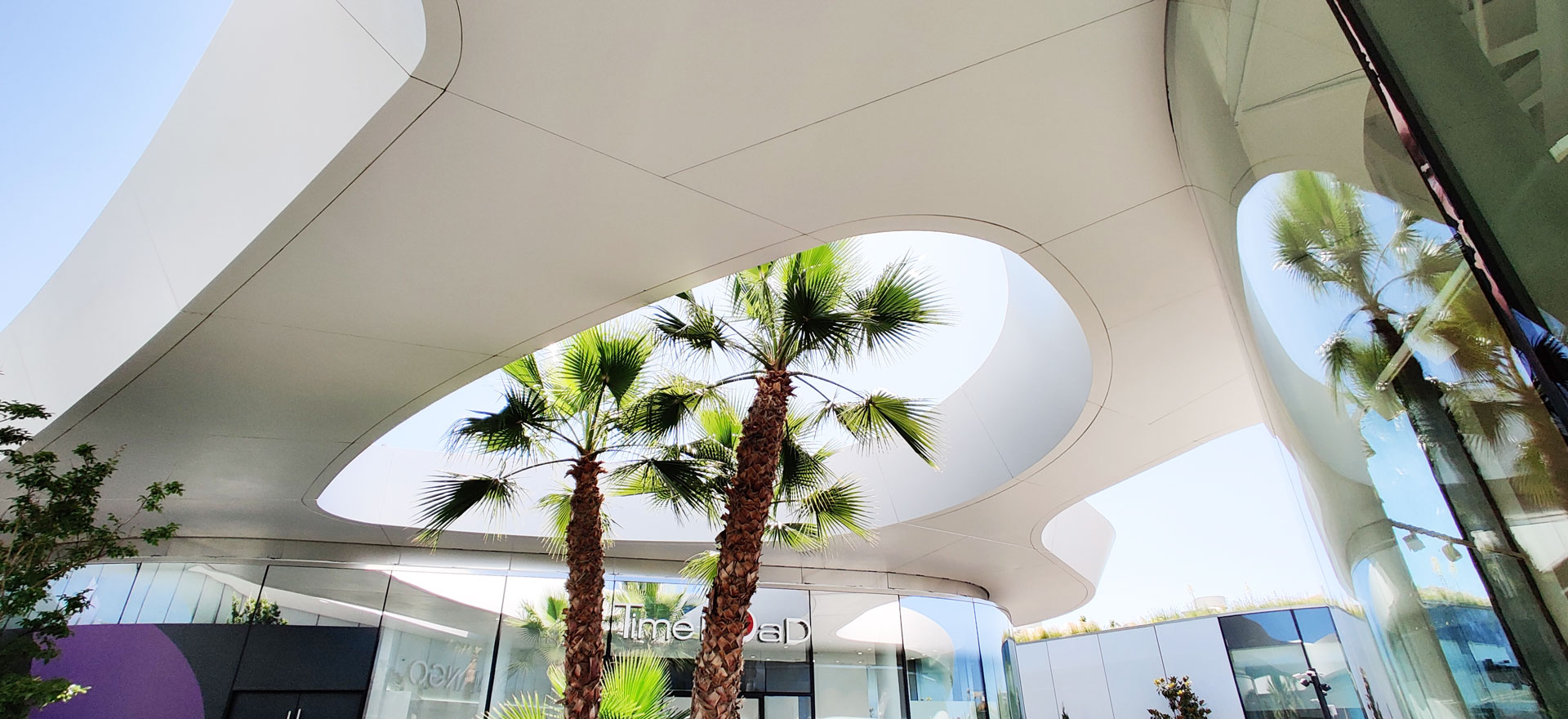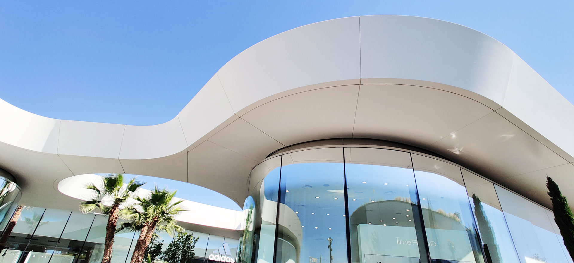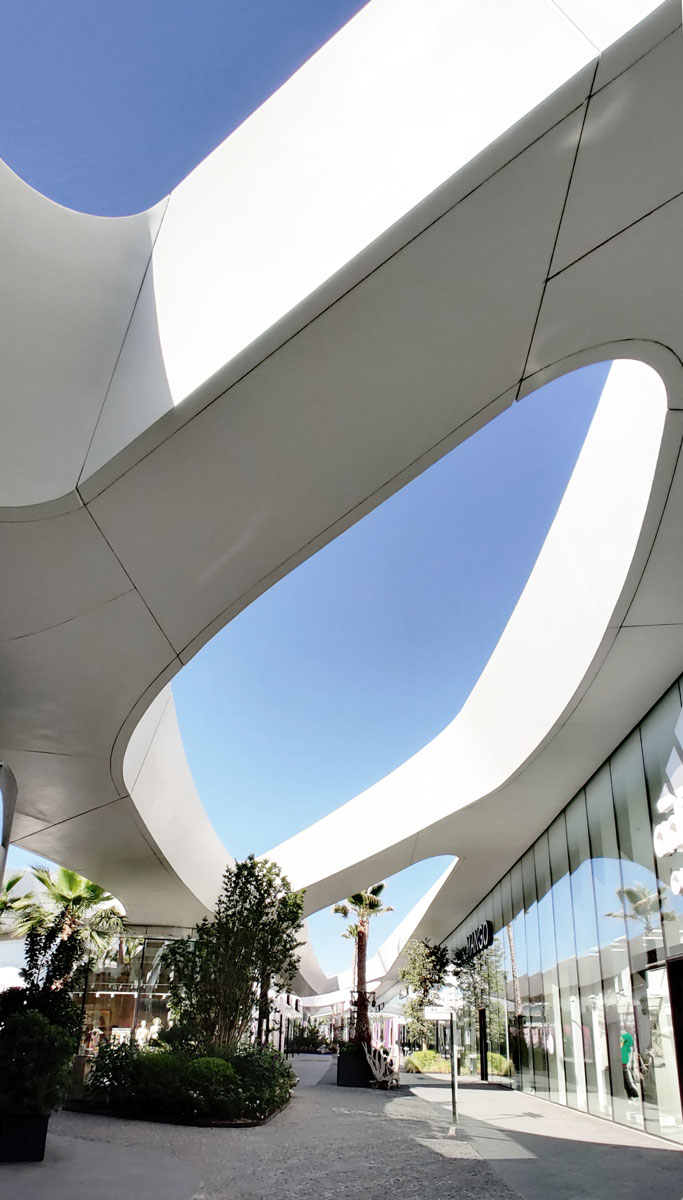 OpenSky is the largest open-air mall in Madrid, offering 75,000 sqm of retail, restaurants, cinemas, and leisure spaces. The project is organized into several volumes unified by a curved white canopy that connects all buildings and shelters the entrances and pedestrian areas. It features the largest parametric prefabricated façade ever built in Spain, with a total length of 3.5 km and a surface area of 23,000 sqm. The façade is divided into modules ranging from 1.20 m to 3.50 m in length, which at different areas function as ceilings, cornices, façade elements, and even railings. There are 2,031 unique modules, each defined by specific parameters, distinct substructures, and tailored auxiliary components. All elements required to define each module — including the steel structure, L-profiles, joints, screws, and even the geometry itself — are generated through algorithmic processes. This workflow avoids repetitive manual tasks while enabling rigorous project control through naming conventions and production protocols essential for industrial manufacturing.