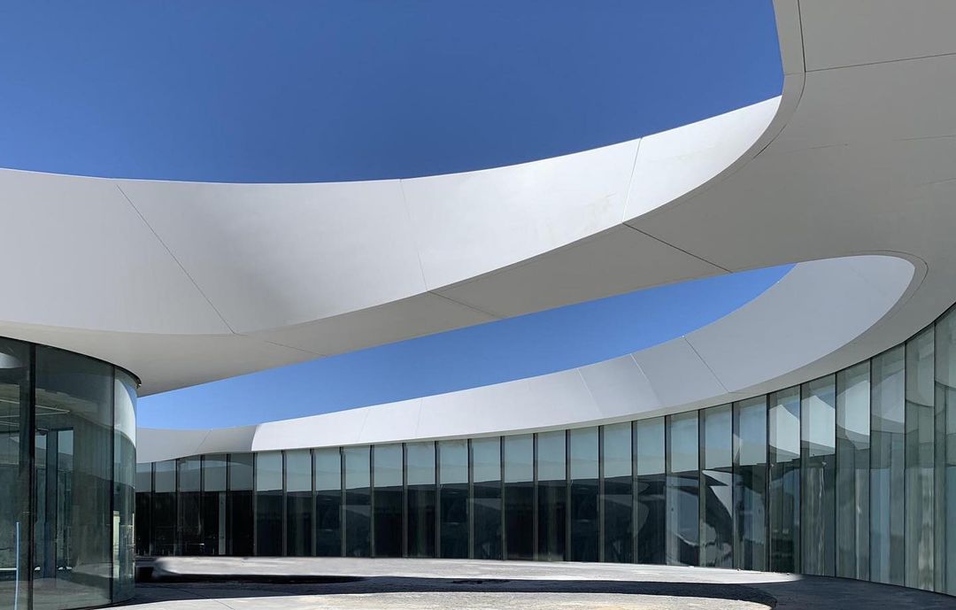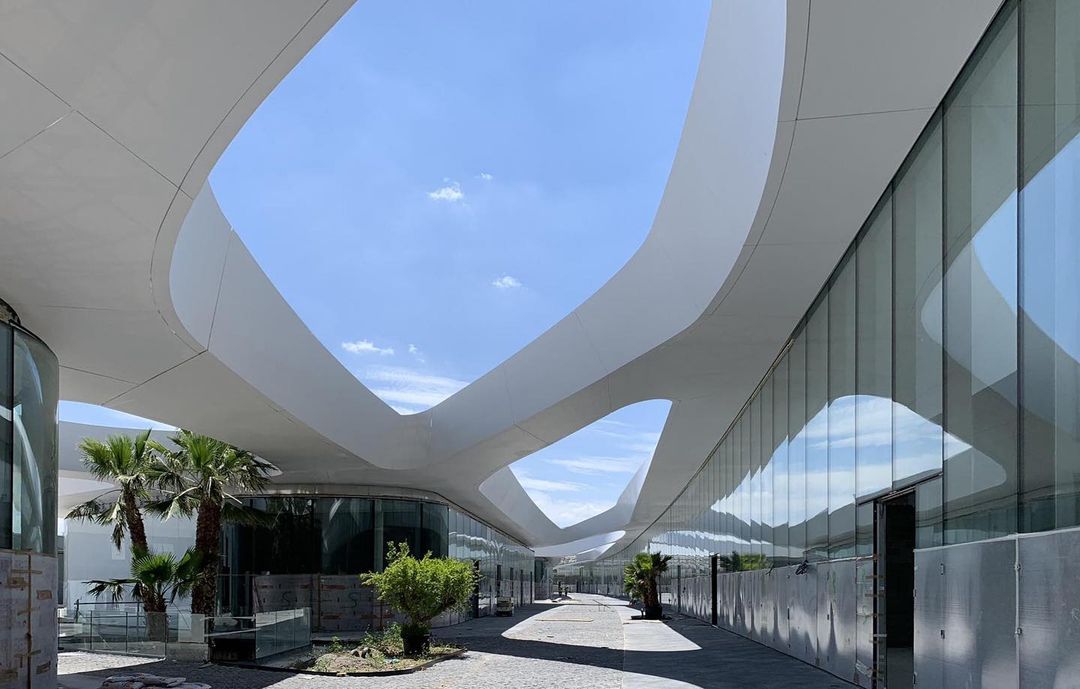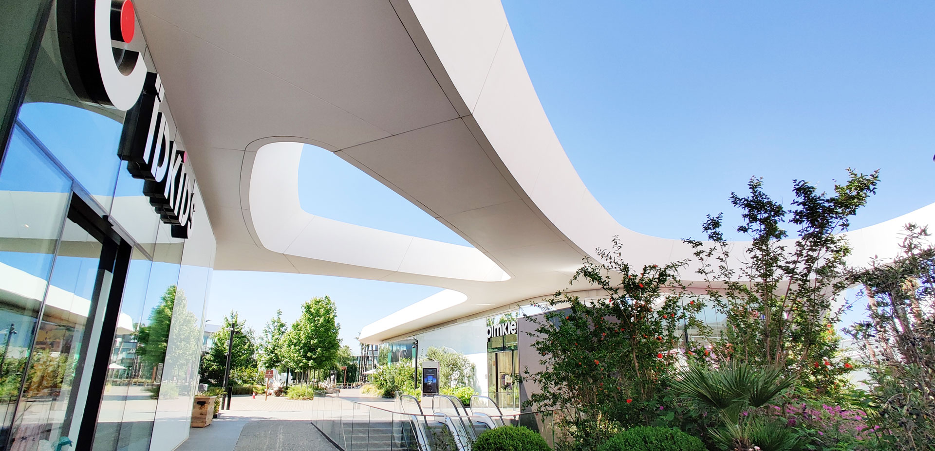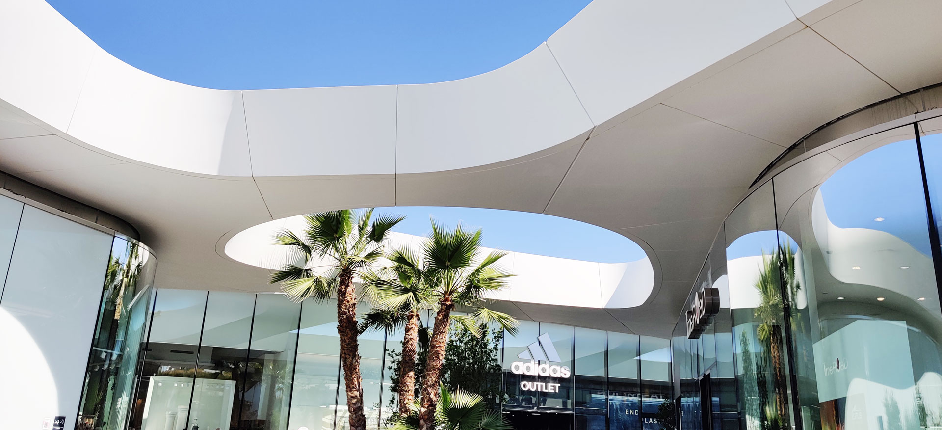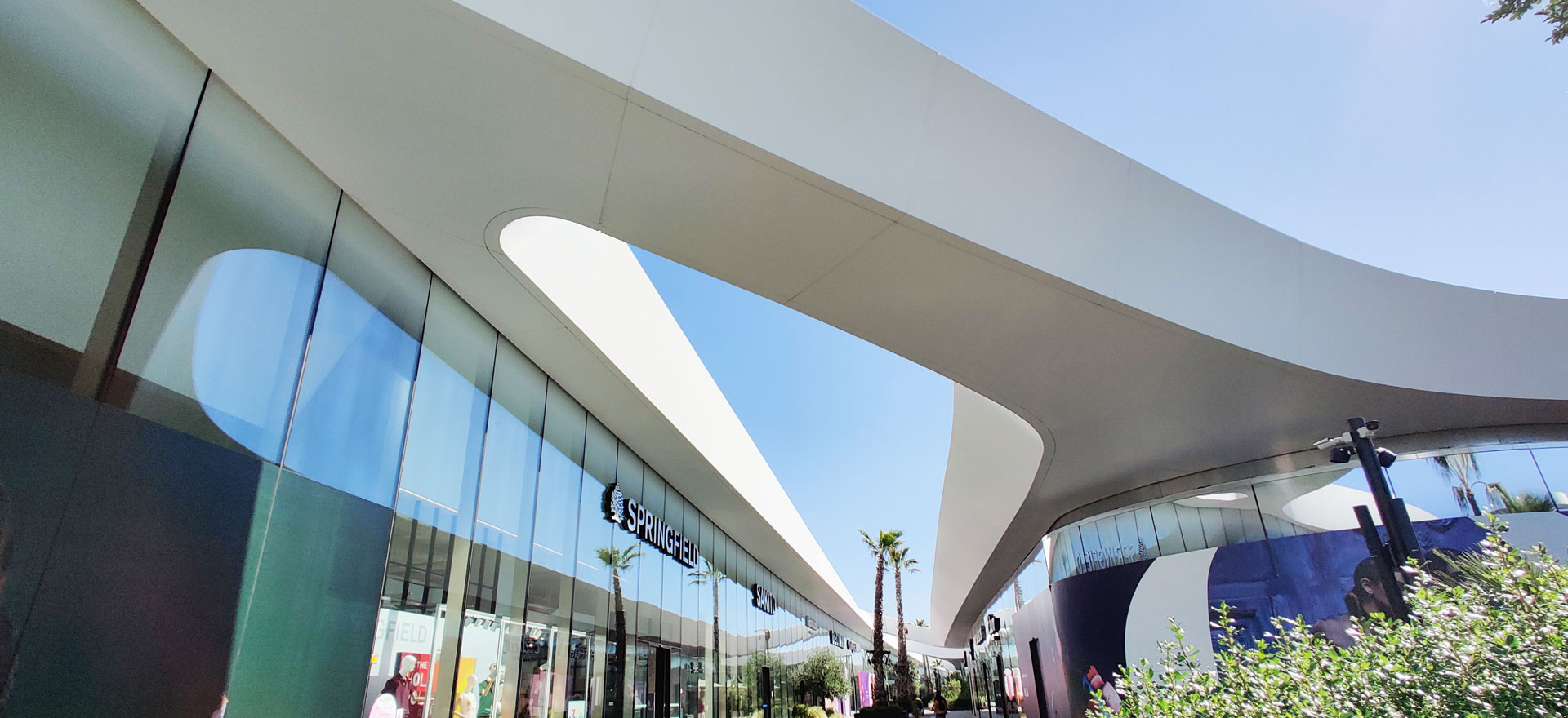 OpenSky is the largest open-air mall in Madrid, offering 75,000 sqm of retail, restaurants, cinemas, and leisure spaces. The project is organized into several volumes unified by a curved white canopy that connects all buildings and shelters the entrances and pedestrian areas. It features the largest parametric prefabricated façade ever built in Spain, with a total length of 3.5 km and a surface area of 23,000 sqm. The façade is divided into modules ranging from 1.20 m to 3.50 m in length, which at different areas function as ceilings, cornices, façade elements, and even railings. There are 2,031 unique modules, each defined by specific parameters, distinct substructures, and tailored auxiliary components. All elements required to define each module — including the steel structure, L-profiles, joints, screws, and even the geometry itself — are generated through algorithmic processes. This workflow avoids repetitive manual tasks while enabling rigorous project control through naming conventions and production protocols essential for industrial manufacturing.