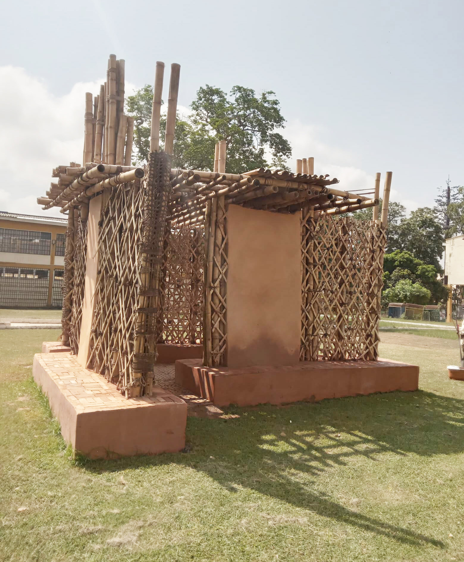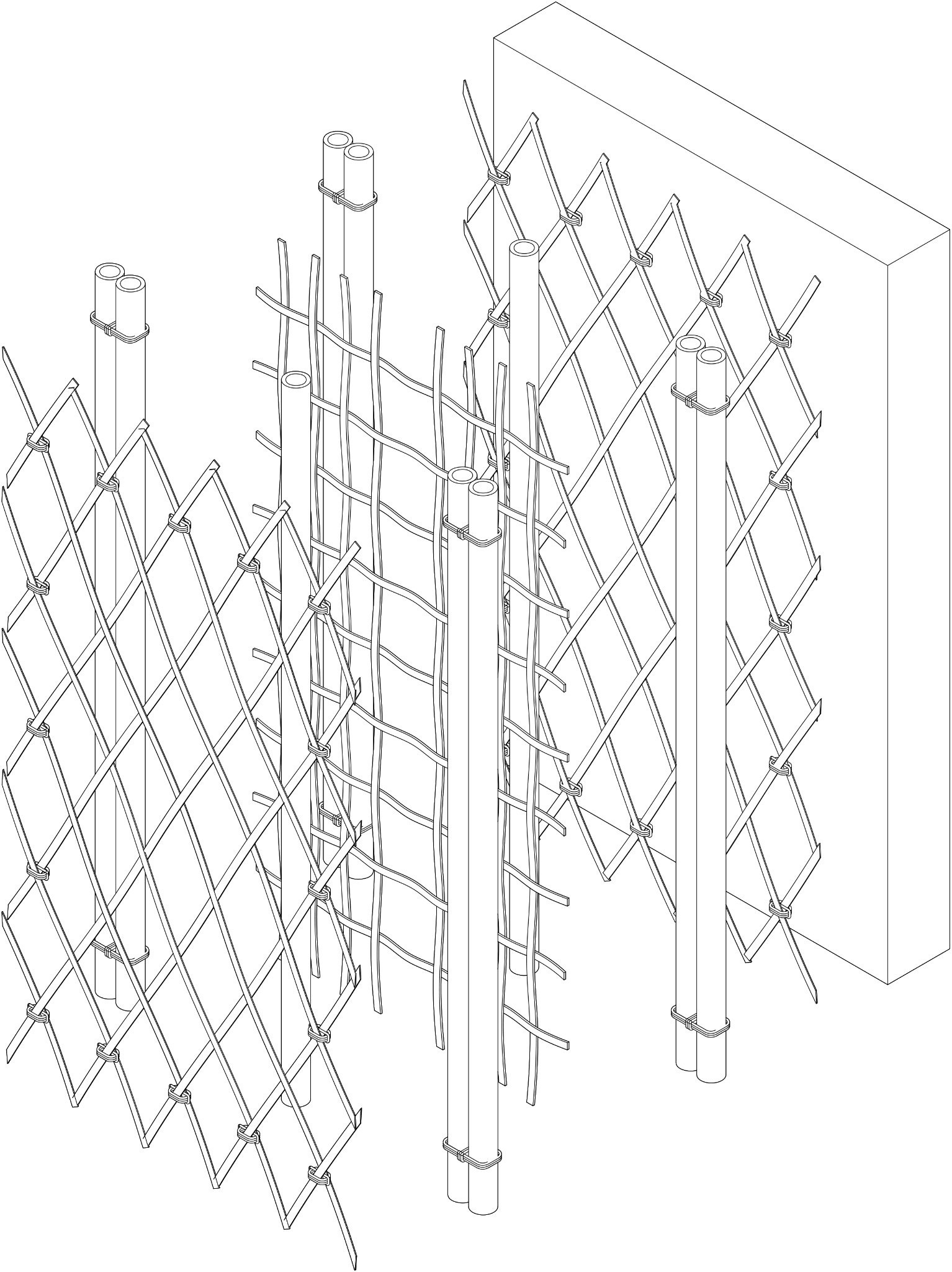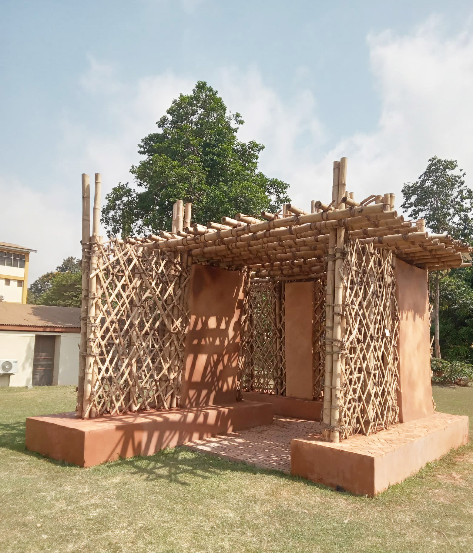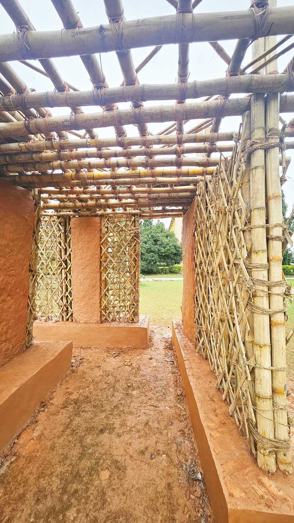 The construction system is based on the use of locally available natural materials, primarily bamboo and plant-based fibres, assembled through techniques rooted in local building traditions. While a 3D model was used as a reference framework, the primary objective was not strict geometric execution, but rather to learn from the material logic, assembly sequences, and construction constraints inherent to these materials and context.