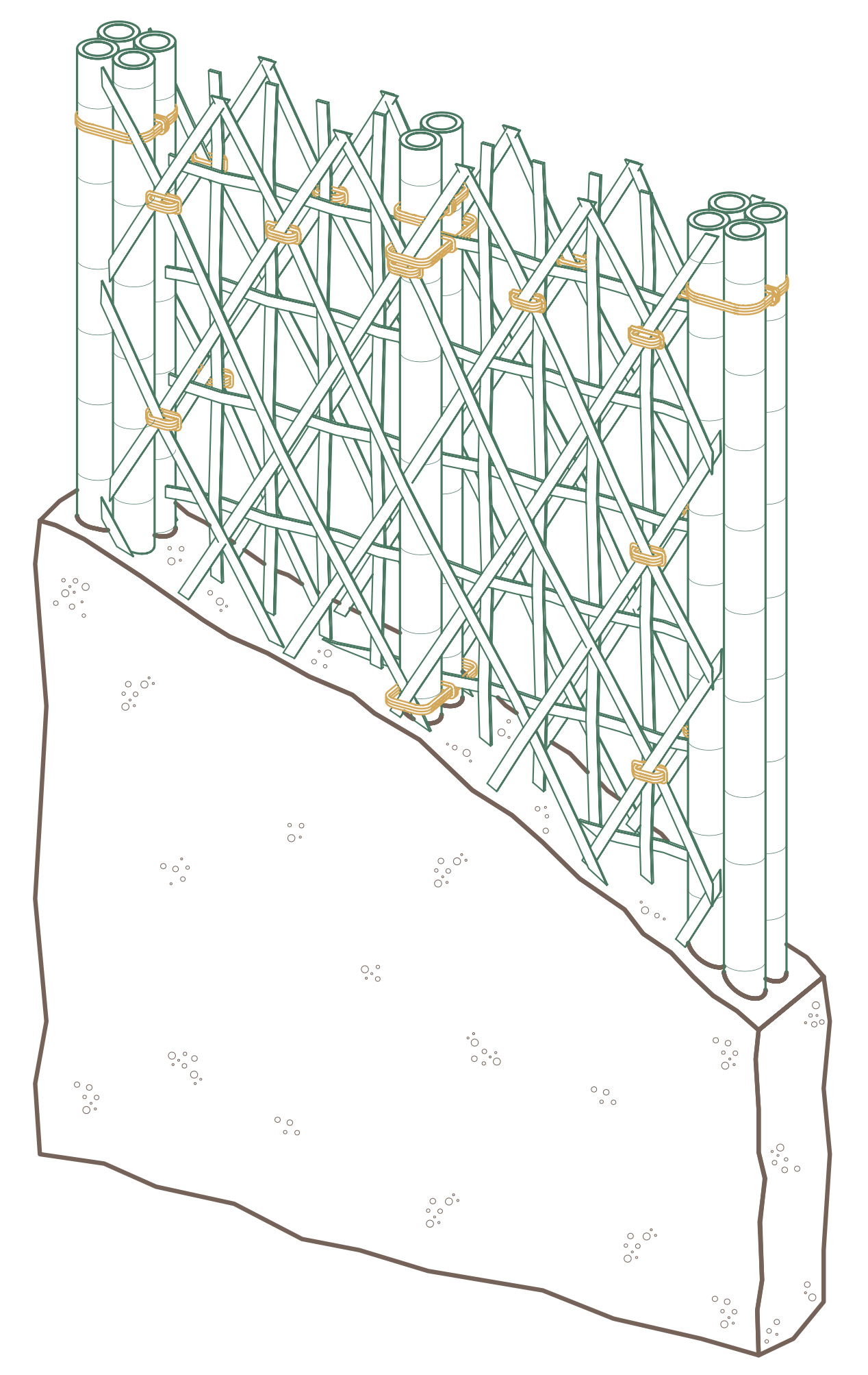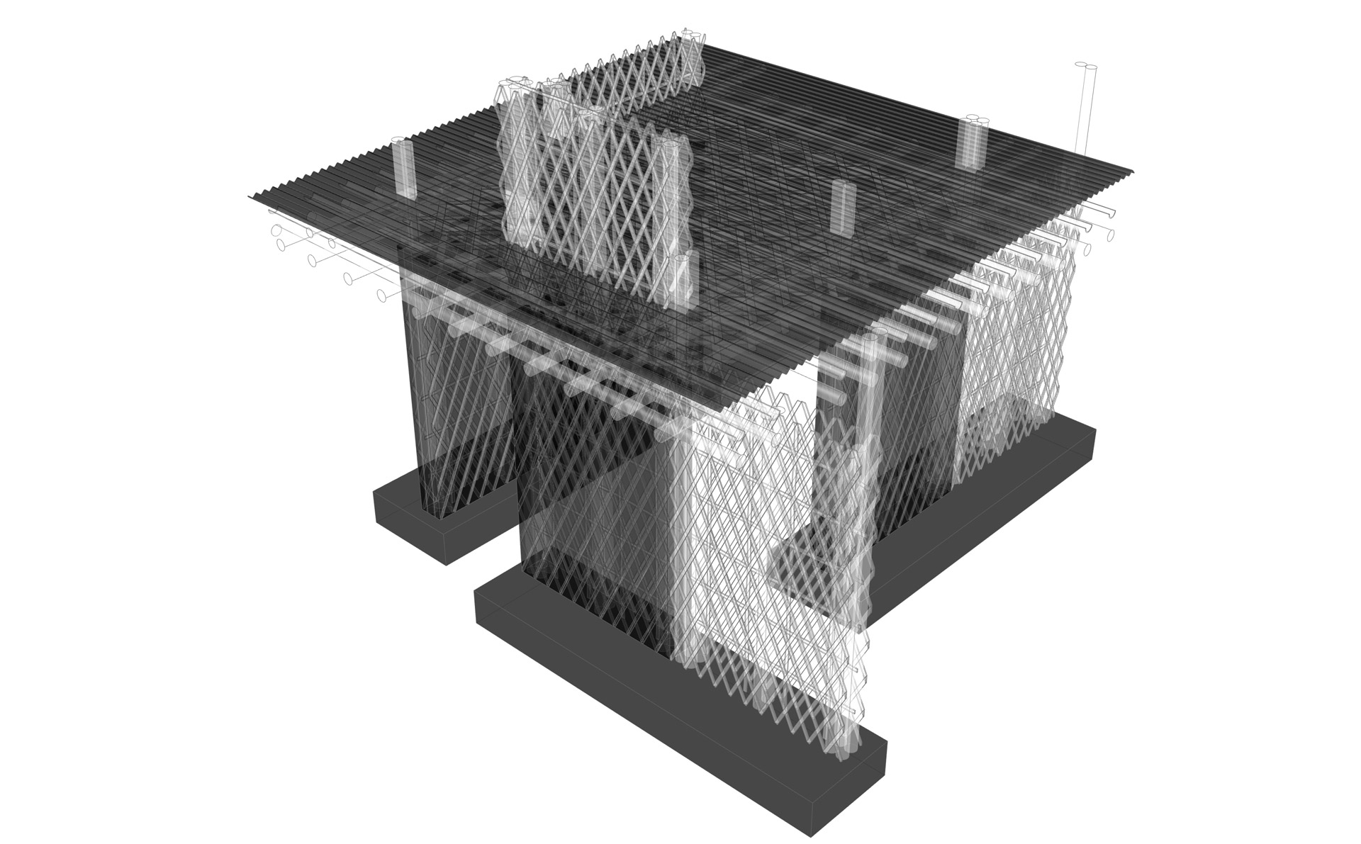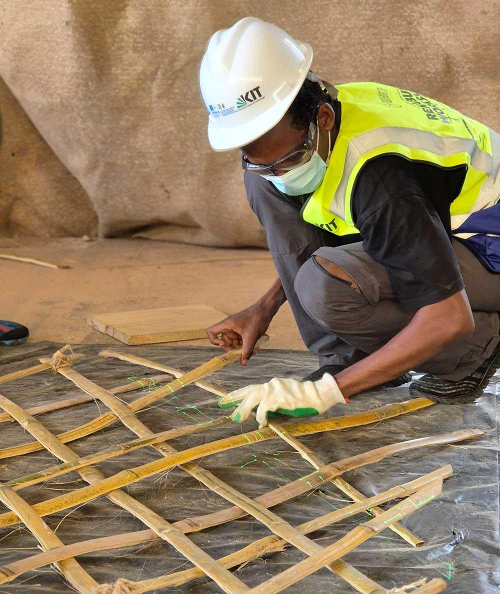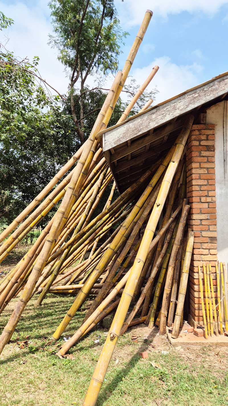 The construction system is based on the use of locally available natural materials, primarily bamboo and plant-based fibres, assembled through techniques rooted in local building traditions. While a 3D model was used as a reference framework, the primary objective was not strict geometric execution, but rather to learn from the material logic, assembly sequences, and construction constraints inherent to these materials and context.