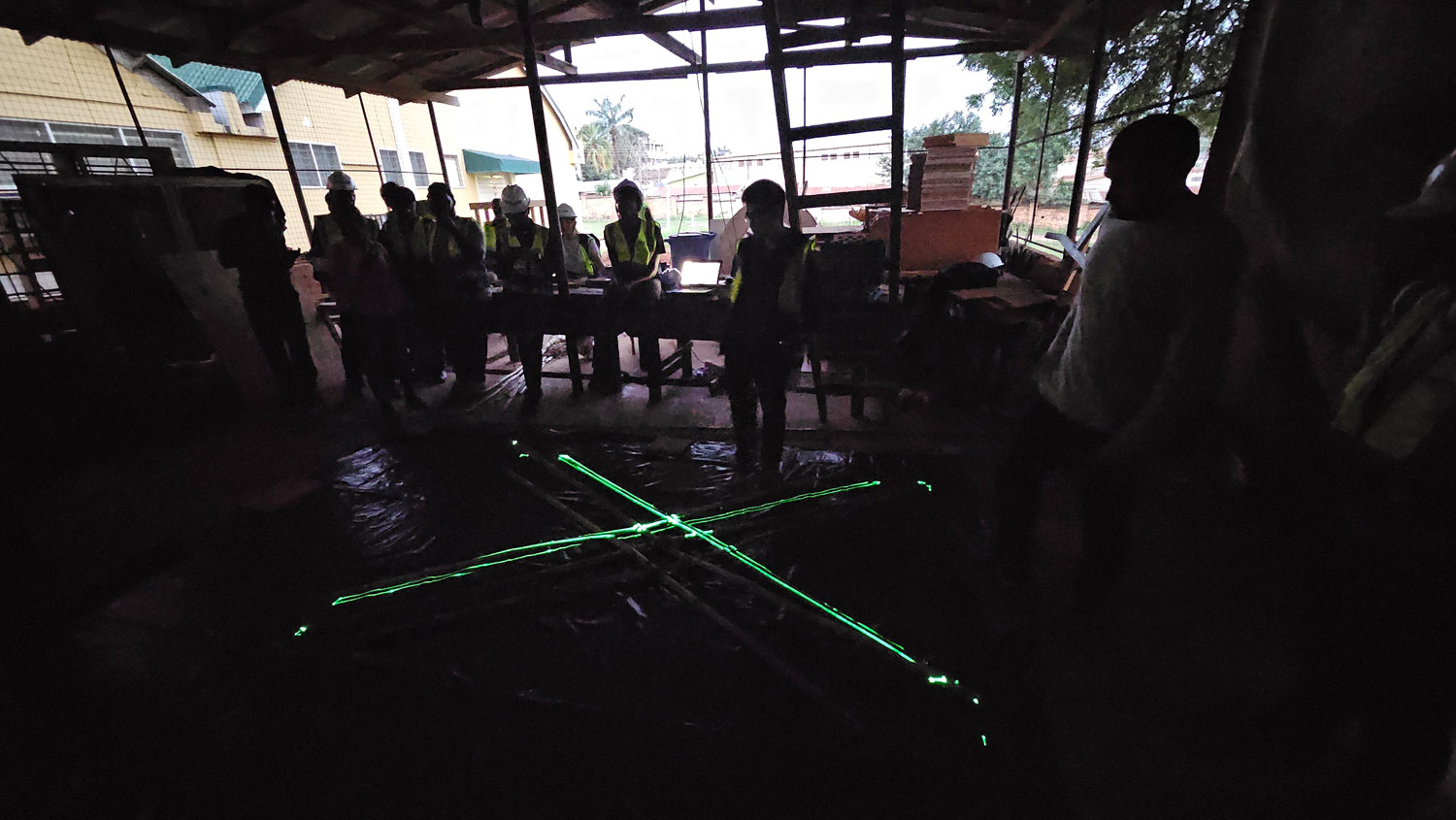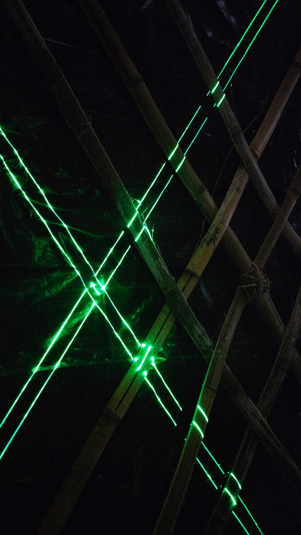 A key research component of Renabuma lies in the exploration of digital design and assisted digital fabrication techniques adapted to low-tech construction environments. The fabrication of bamboo mats using split bamboo elements was guided through a laser-based projection system, which provided real-time visual instructions during assembly.
